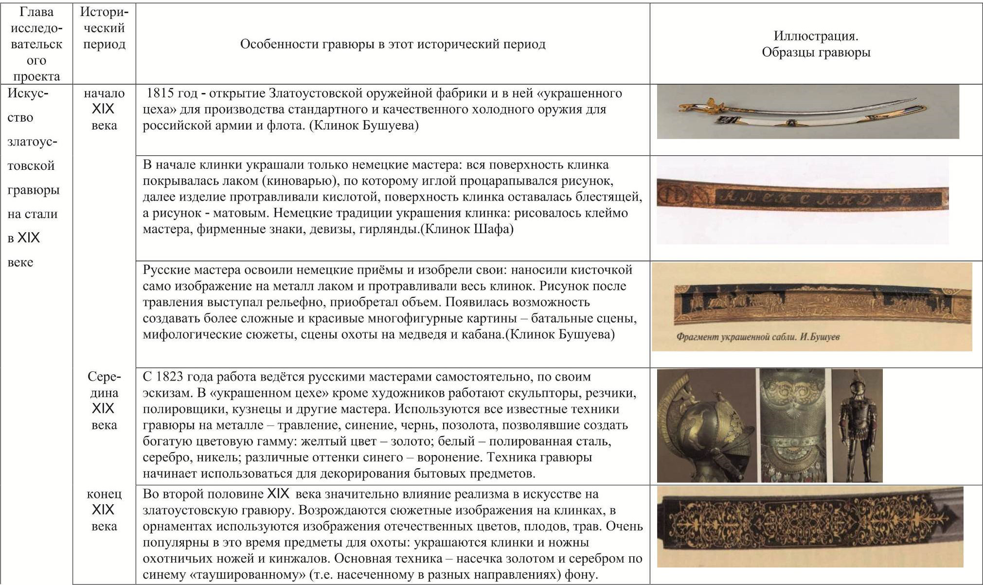 Каждая глава содержит теоретическую часть, дополненную описанием практической части исследования, включающую знакомство с производством клинков и экскурсию по городским местам, где исторические факты оживают и становятся наглядными и доступными каждому, а современность вплетается в историю[1]. В работе мной были использованы следующие методы: метод сравнительного анализа; метод экспертной оценки; метод контент-анализа (содержательного анализа); метод социологического исследования в форме интервьюирования. Златоустовской гравюре на стали посвящено немало специальных работ. В частности, можно назвать книги М. Глинкина «Златоустовская гравюра на стали» [4], М.Денисовой «Художественное оружие XIX века Златоустовской оружейной фабрики» [5], «Златоуст – город мастеров» [6], Ю.Б.Рябкова «Современное состояние Златоустовской гравюры на стали» [17]. С другой стороны, вопросы истории Златоустовского оружейного искусства с неизбежностью затрагивались в трудах по истории Урала и краеведению общего характера, например, в книгах Черноскутова А.П. и Шинкаренко Ю.В. «Малахитовая шкатулка. В поисках новых ключей» [21]; Рундквиста Н.А. «Сто дней на Урале» [16] и других. Наибольшую помощь мне в моей работе оказали следующие издания: Ю.Окунцов «Златоустовская оружейная фабрика» [15], Козлов А.В., Заева Л.П. «С именем Златоуст» [12], а также материалы Златоустовских краеведческих конференций разных лет под редакцией Шадриной Т.В. [22; 23]