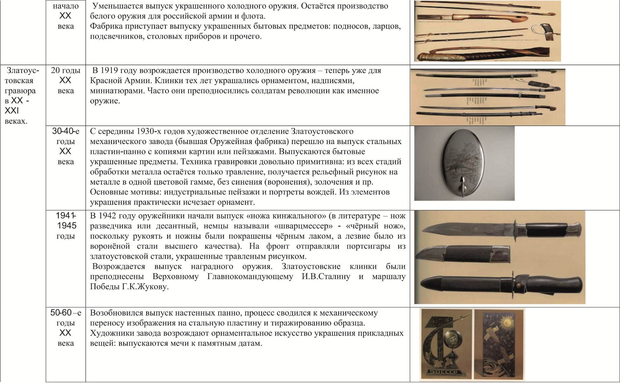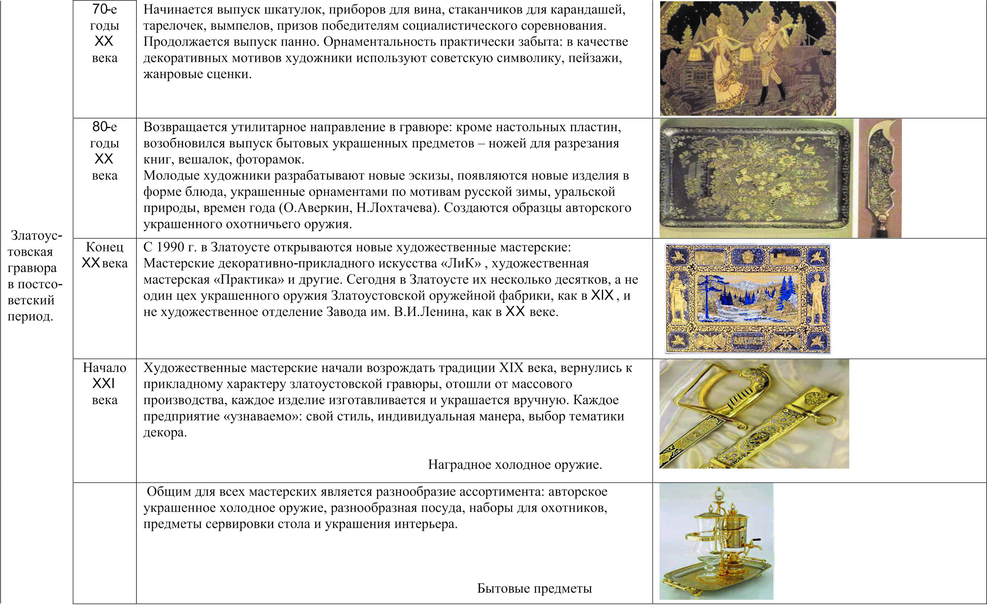 Приложение 1. Сравнительная таблица развития златоустовской гравюры на стали в XIX - XXI вв.