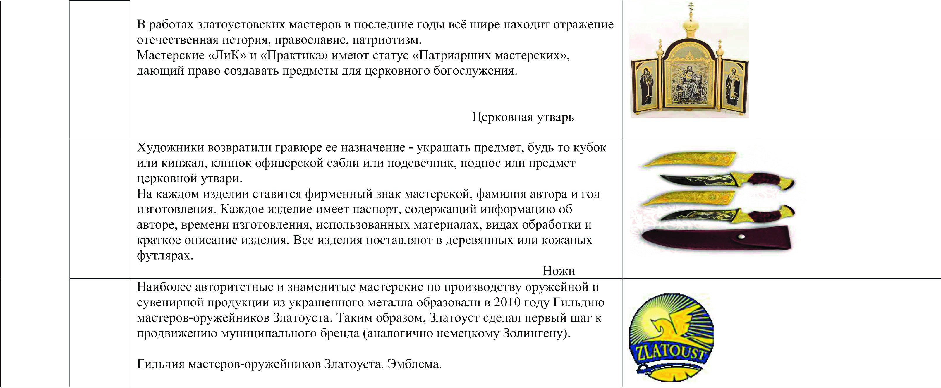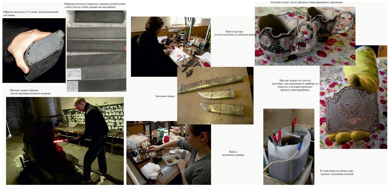 Я был в выставочных салонах Компании «АиР», «Златоустовской оружейной фабрики», «Росоружие», завод «Булат», мастерской «Оружейникъ». На «Златоустовском заводе оружейных специализированных сталей» я смог познакомиться со всем процессом производства украшенного оружия от заготовки «кованца» до готовых ножей и других изделий, выполненных в технике златоустовской гравюры на стали. Старинные способы ручной ковки и нанесения рисунка сочетаются с современными гальваническими процессами и созданием компьютерных макетов будущих изделий. Это, в основном, штучное производство, часто по индивидуальным заказам. Каждое изделие индивидуально – от выбора марки стали до украшения клинка, рукояти, ножен, выбора дизайна письменного прибора или нанесения рисунка на столовый прибор, упаковки.
