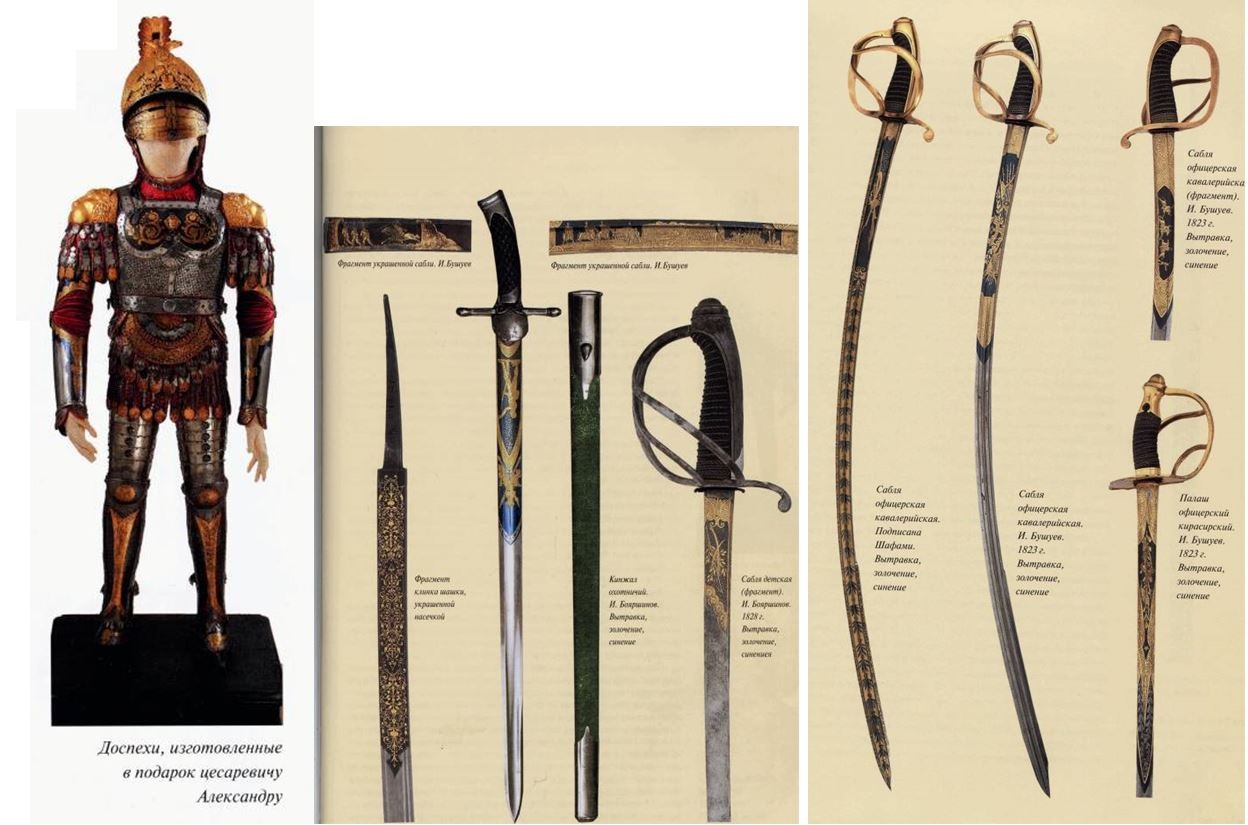 Иван Николаевич Бушуев по праву считается основоположником златоустовской школы украшенного холодного оружия. Вершиной творчества Бушуева, его лебединной песней, стало так называемое «Древнее вооружение» - комплект рыцарских доспехов, создававшихся для наследника российского престола цесаревича Александра Николаевича. Работа над этими доспехами по эскизам Бушуева велась златоустовскими мастерами-оружейниками первой половины XIX века четыре года (с 1830 по 1834 г.г.). Работали скульпторы, резчики, полировщики, кузнецы и другие мастера, доводящие изделие до желаемого совершенства. При украшении доспехов были использованы все известные к тому времени и применявшиеся на Оружейной фабрике техники гравюры на металле – травление, синение, чернь, позолота, позволившие создать богатую цветовую гамму: желтый цвет – золото; белый – полированная сталь, серебро, никель; различные оттенки синего – воронение – «фирменный» бушуевский глубокий синий цвет. В 1834 году готовые доспехи были вручены четырнадцатилетнему наследнику престола, долгое время они хранились в Эрмитаже, а в 1928 году усилиями местных краеведов были переданы Златоустовскому краеведческому музею, в экспозиции которого находятся и сейчас.